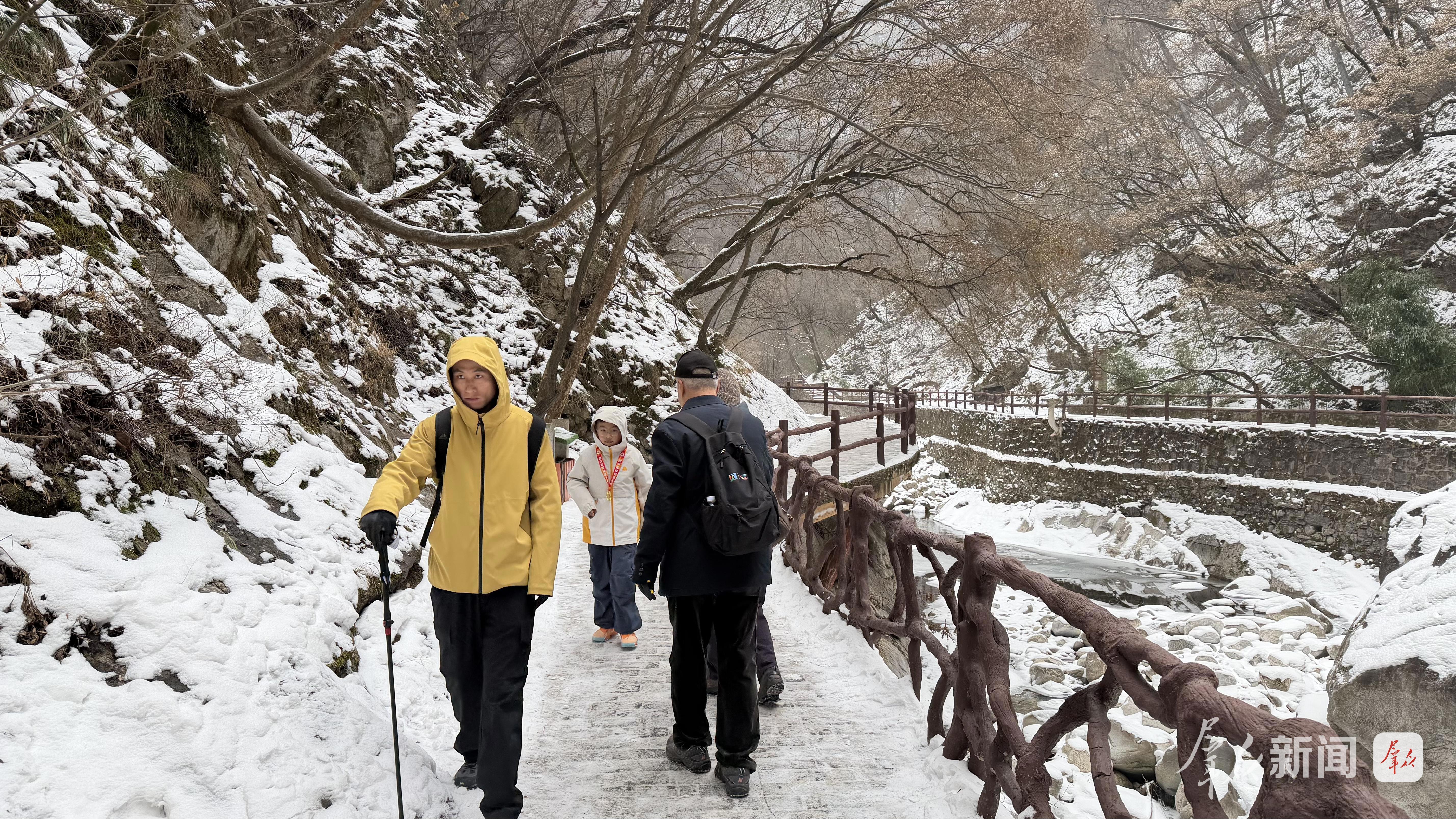 在戲雪區(qū),孩子們戴著棉帽手套,在雪地里堆雪人、擲雪球,歡呼聲此起彼伏;家長(zhǎng)們則在一旁拍照留念,偶爾加入游戲,親子互動(dòng)其樂(lè)融融。“這里的雪很干凈,步道也平整,很適合帶老人和孩子來(lái)玩?!奔易⊙泺Q湖附近的劉樂(lè)琪女士說(shuō),自己是太平峪的???,春季來(lái)看紫荊花海,秋季來(lái)賞紅葉、瀑布。今年新增的戲雪項(xiàng)目讓她又多了一個(gè)出游選擇。